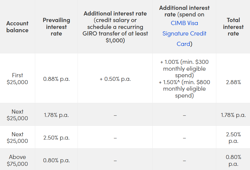 与此列表中的其他账户相比,CIMB FastSaver账户的运作方式略有不同。它确实有常见的条件如工资和信用卡消费要求——但这些条件只是为了解锁前25000新币的最高利率(目前为年利率2.88%)。