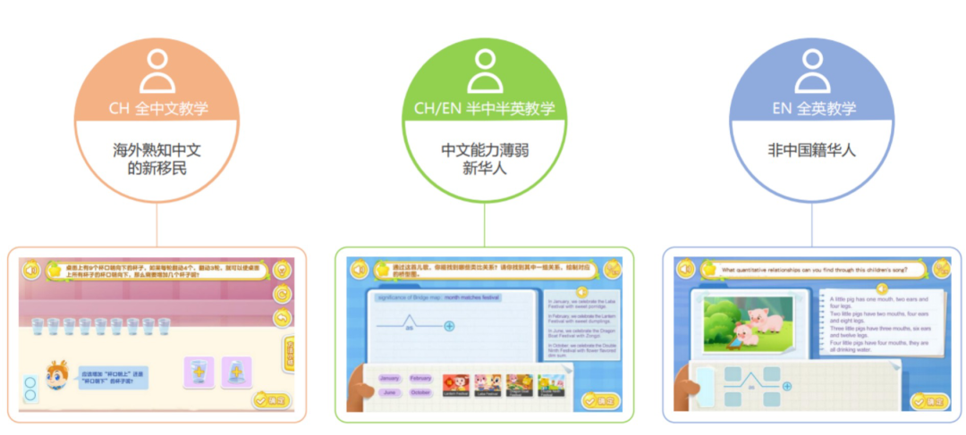 豌豆思维海外用户根据语言熟知度分为三大类,目前待上线DEMO课有多种语言版本,基本满足各种语言能力的用户所需。