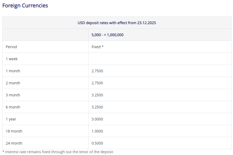 大华银行目前最佳美元定存利率为1个月或的3.40%。同样也需要存至少25万美元才有。