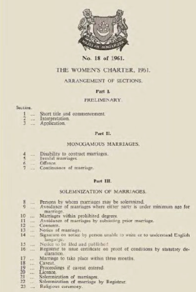 所有离婚、财产、赡养、孩子问题,核心法律依据只有一部——《妇女宪章(Women’s Charter)》。