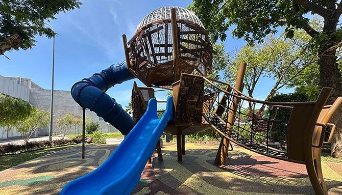 想让孩子兼顾玩乐与晒太阳补维生素 D?Hub & Spoke 设有游乐场,孩子们可在这儿尽情攀爬、探索多层游乐设施,享受欢乐时光。