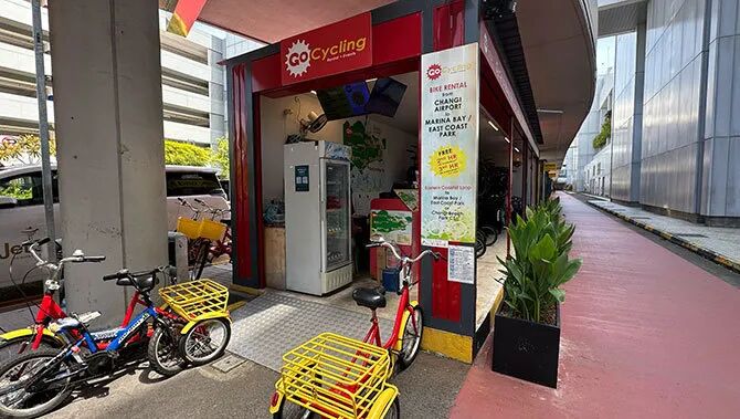 Hub & Spoke 地处樟宜机场连接线一端,设有 GoCycling 自行车租赁店,提供多种车型,可骑行探索连接线、东海岸公园,兴致高还能一路骑至滨海湾。