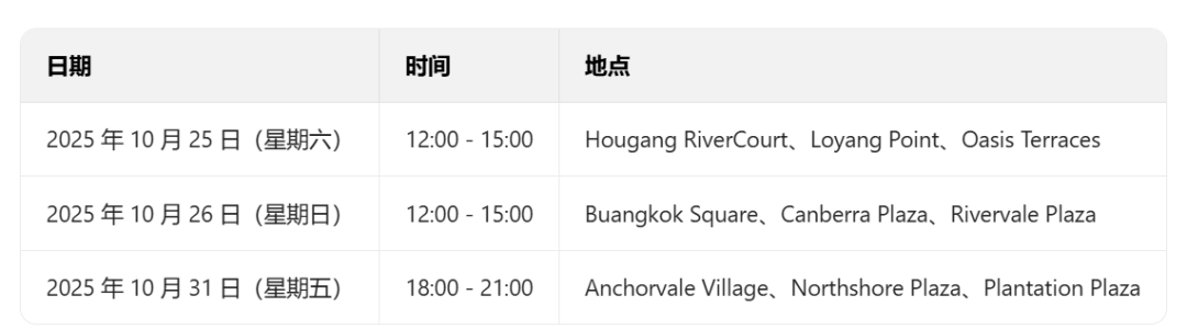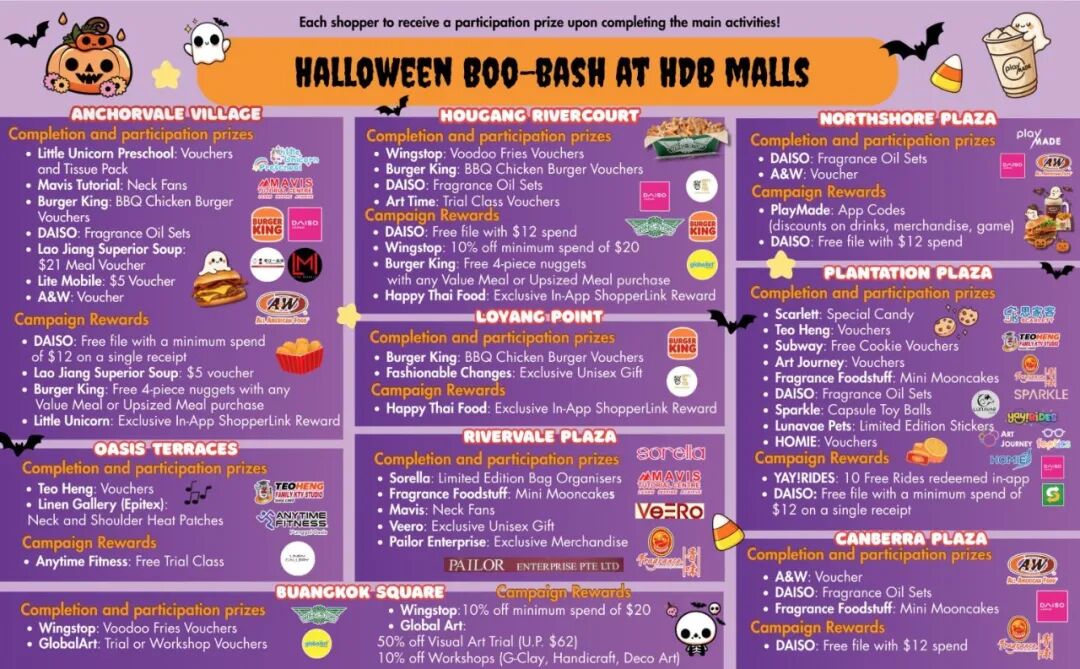 在十月,九个购物中心(Hougang RiverCourt、Loyang Point和 Oasis Terraces、 Buangkok Square、Canberra Plaza、Rivervale Plaza、 Anchorvale Village、Northshore Plaza、Plantation Plaza)将为孩子们和家庭举办一场充满欢乐的万圣节派对,这些活动将于10月25日、26日和31日举行,欢迎所有人参与其中!