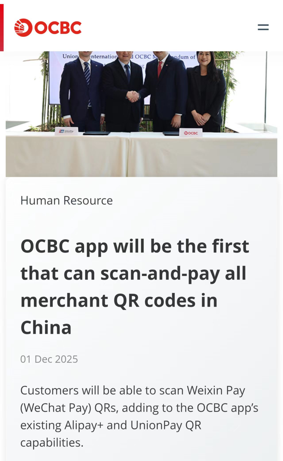 华侨银行此次打通微信支付,让新加坡旅客在中国支付体验大幅提升。2026年功能上线后,只需一个OCBC应用,即可畅行中国扫码场景,真正实现 “旅行支付无国界”。