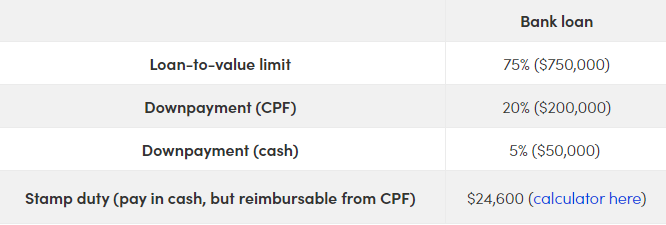 若选择银行贷款,首付款为2万新元(5%)现金 + 8万新元(20%)公积金
