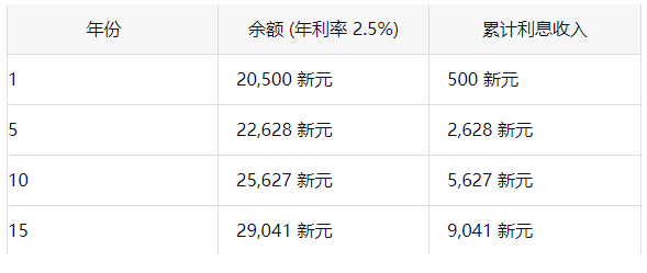 以利率最低的OA为例,假设你填补了20000新币进入CPF OA,15年后获得的利息几乎等于本金一半了!