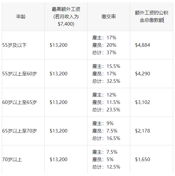 这就意味着,如果你年过70岁,每个月能赚7400新币的话,那你仍旧需要为13200新元的额外工资需要缴纳公积金。