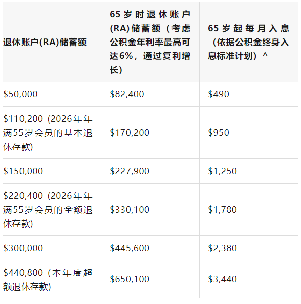 通过公积金终身入息计划,你也将在65岁起在退休期间每月获得入息。对于在2026年年满55岁的人,根据公积金终身入息标准计划,预估入息如下: