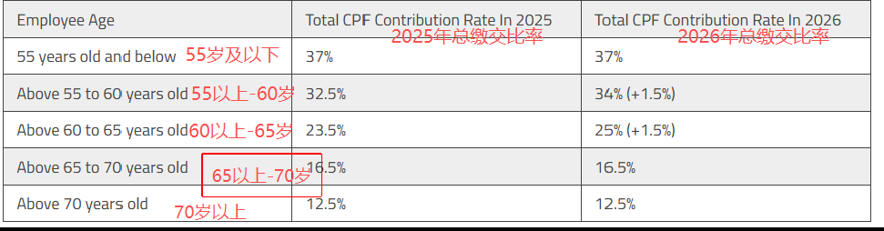 从2026年1月1日起,年龄在55岁至65岁以上员工的公积金缴交率将会提高。这些变化适用于从2026年1月1日起赚取的工资(括号内为增加的比例):