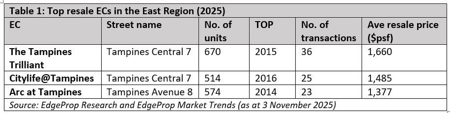 在今年东部地区成交的204个转售EC单位中,The Tampines Trilliant(36宗交易)以最高转售成交量居首。受市场欢迎度推动,该项目(每平方英尺1,660新元)同时录得最高平均转售价,均高于东部地区整体(每平方英尺1,332新元)及全岛平均转售价(每平方英尺1,383新元)。