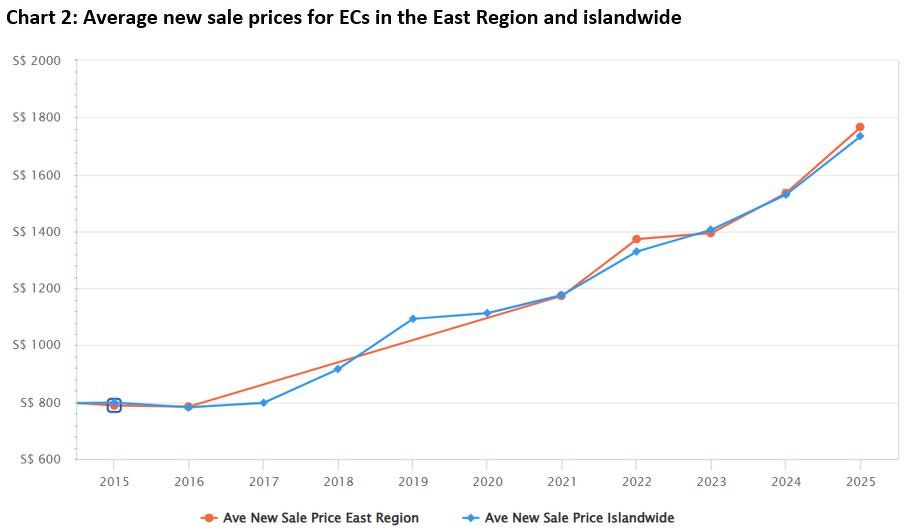 而新加坡东部地区EC的新销售均价自2024年以来同比增长15.1%,高于全岛EC13.5%的同比涨幅。鉴于更强劲的价格增长,东部地区新EC以每平方英尺1,767新元的均价领先于全岛平均的1,735新元并不令人意外。