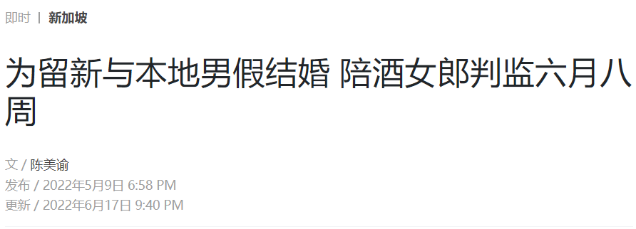 当时,一名中国籍陪酒女,为了获得长期探访准证以留在新加坡工作赚钱,与一名新加坡本地男子假结婚,最终被判坐牢六个月又八周!