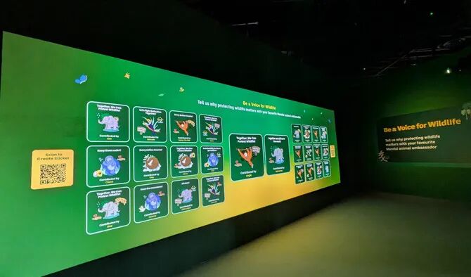 离开Mandai Gallery前,可扫码制作个性化贴纸支持野生动物!选择野生动物大使、上传信息与姓名,数字贴纸将同其他承诺一起投影上墙,还能通过捐款助力保护工作。