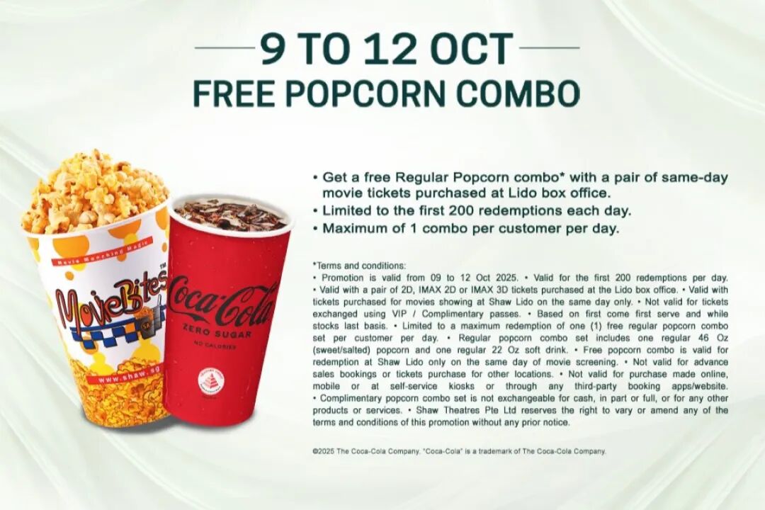 10 月 9-12 日,Shaw Theatres Lido影院观众购每对电影票,可换 1 套含普通爆米花与一杯饮料的套餐,每日限前 200 份,Shaw的爆米花被一些影评人认为是新加坡所有影院中口感最佳的。