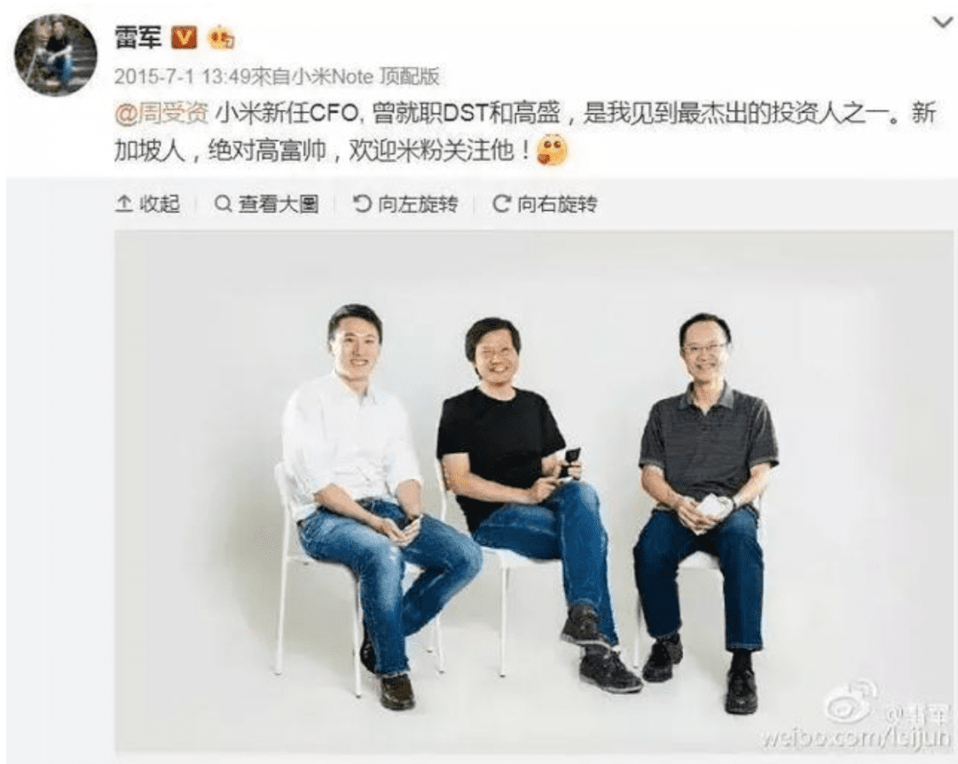 到了15年,周受资跳槽小米,出任小米第二任CFO。