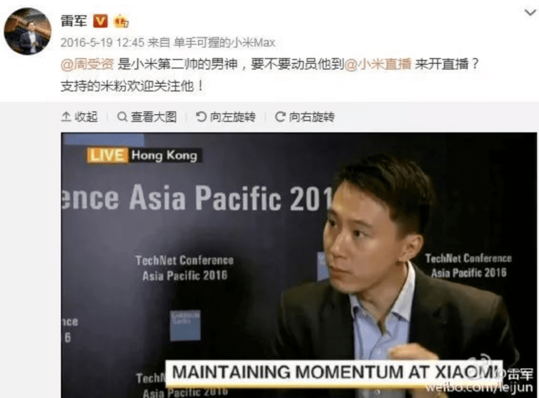 雷军对周受资的工作能力和颜值都非常认可,一年后,雷军再次再微博上cue周受资为“小米第二帅的男神”。