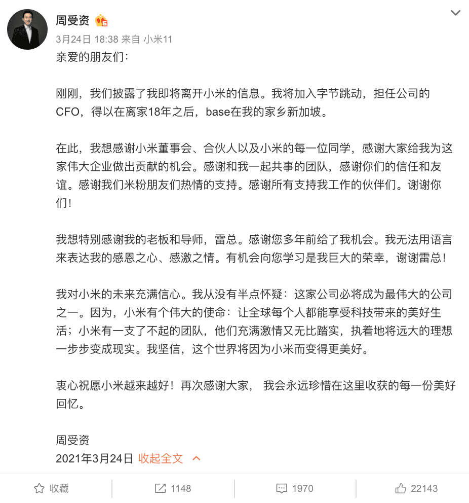 在唯一留下的微博里,周受资公开了自己的工作变动情况,并对雷军和小米进行了感谢。