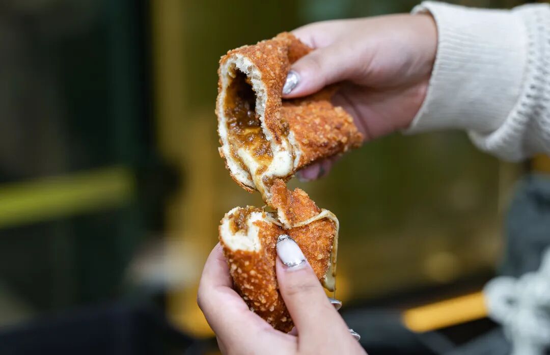 夹有奶酪和肉咖喱的柔软面包经过油炸后,散发出诱人的金黄色泽,售价5.60新元。