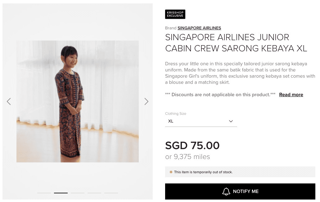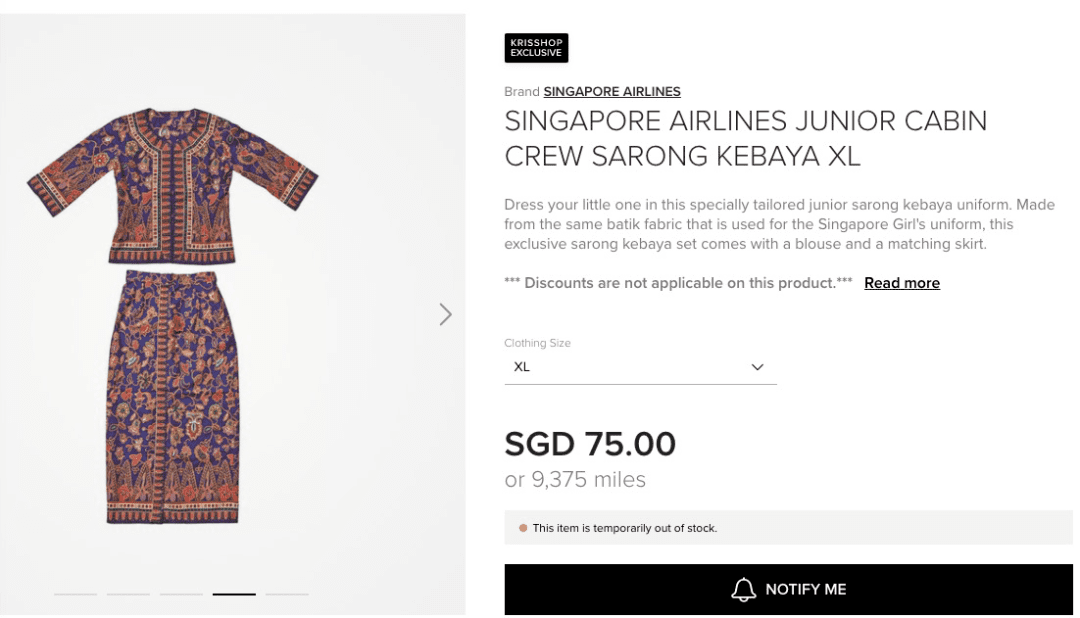 不知道后续还会不会补货呢,每套衣服售价是75新币(约350人民币)或者 9375 miles里程数。