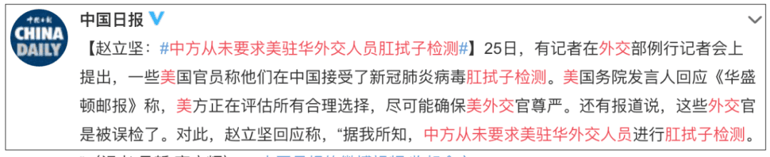 中国外交部非常直白地告诉他们,中方从未要求美驻华外交人员做肛拭子检测。
