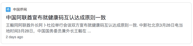 就在3月28日,中国外长王毅同阿联酋外长阿卜杜拉共同宣布,中阿达成健康码互认的原则一致。