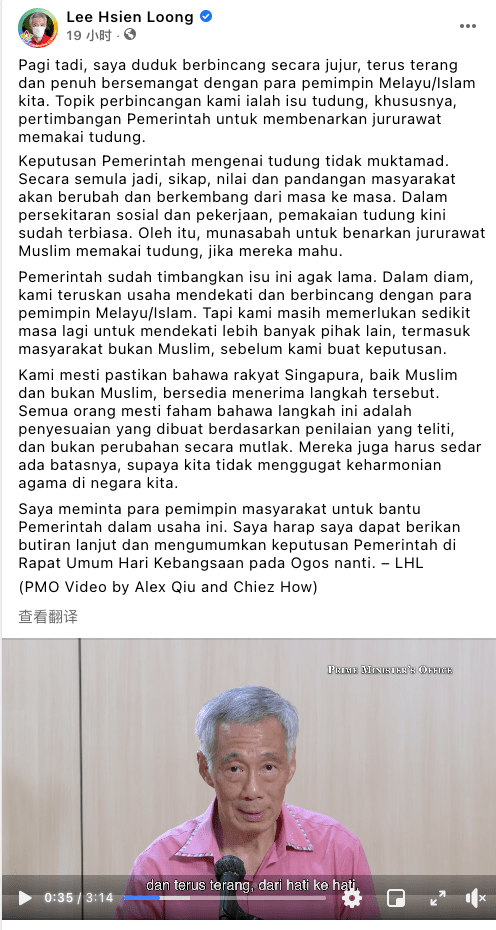 李显龙发视频宣布:新加坡这些行业的穆斯林工作时可戴头巾~