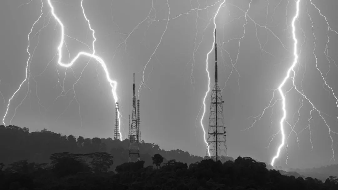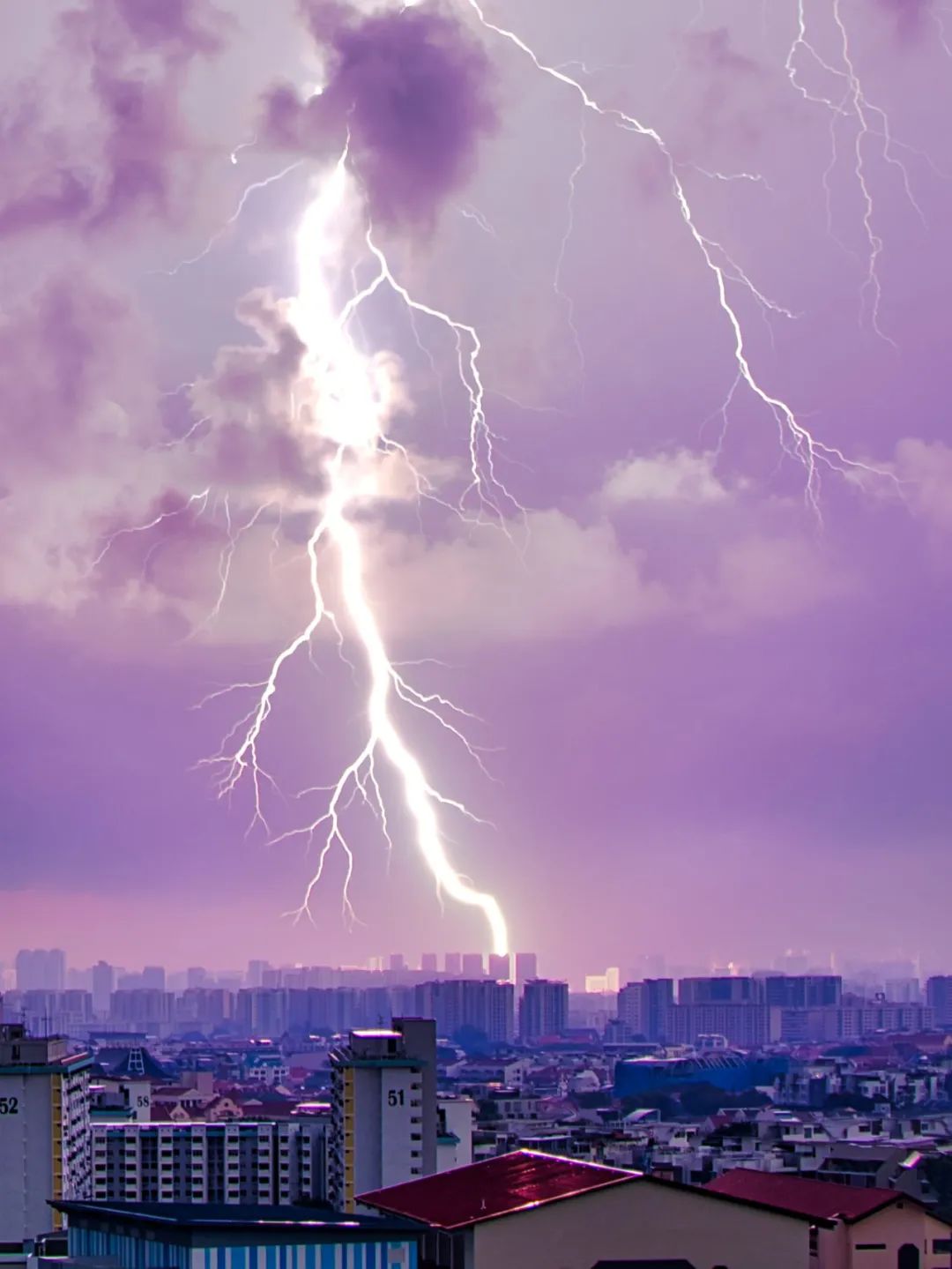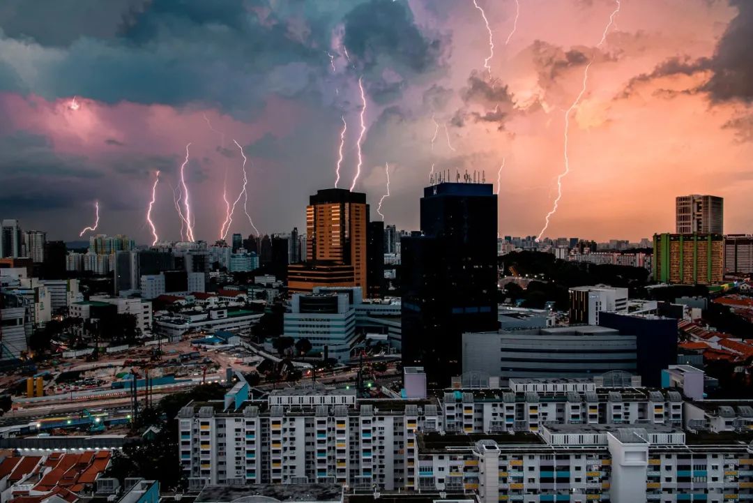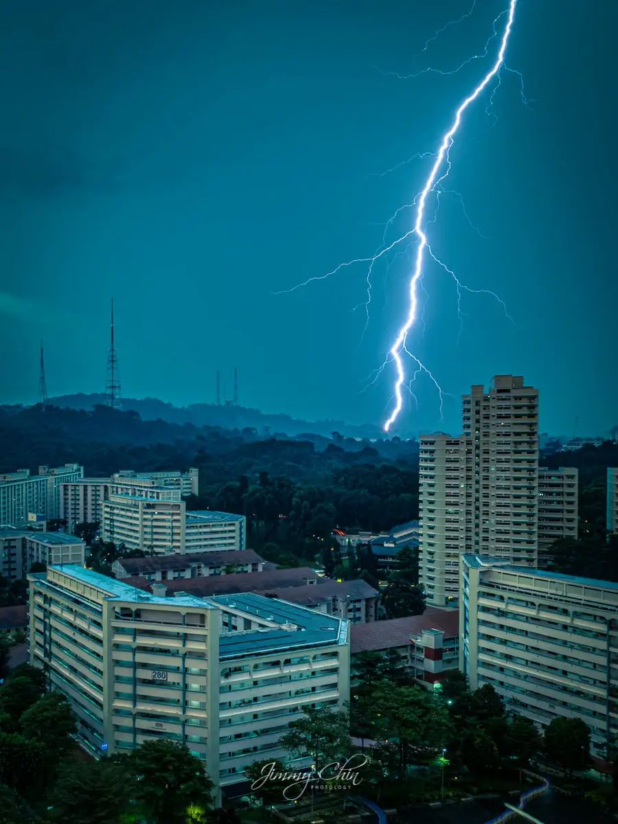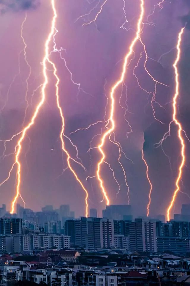 粗壮的闪电就跟一条树藤一样,从天上甩下来,从视觉上来看就跟劈在了最远处的一栋楼顶一般。↓