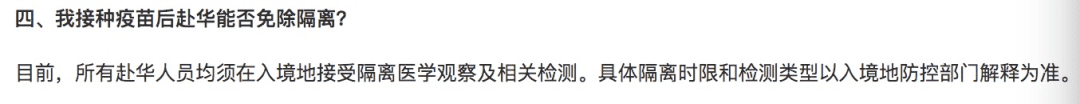 “目前,所有赴华人员均须在入境地接受隔离医学观察及相关检测。具体隔离时限和检测类型以入境地防控部门解释为准。”