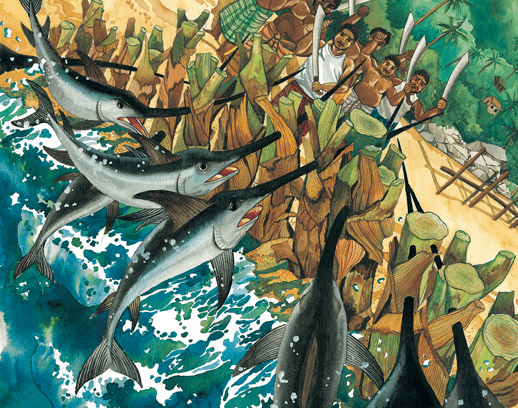 一个聪明的小男孩,他亲眼目睹了村民和渔民遭到箭鱼(有些说法是花旗鱼)的袭击,想到一个聪明的解决办法。