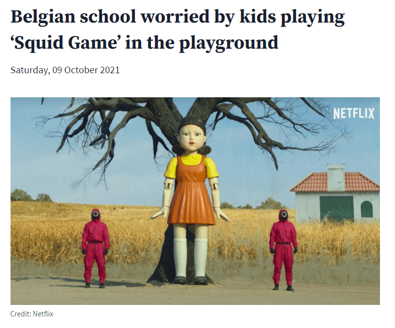 有报道称,比利时一所学校里年仅11岁的学生受到《鱿鱼游戏》的启发,在校园内玩123木头人游戏,