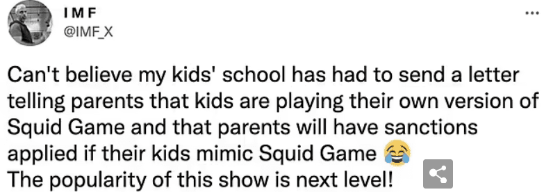 “不敢相信我孩子的学校不得不发一封信告诉父母,孩子们如果被发现在玩他们版本的《鱿鱼游戏》,父母将受到制裁。这个电视剧的火爆程度真是不一般 ”