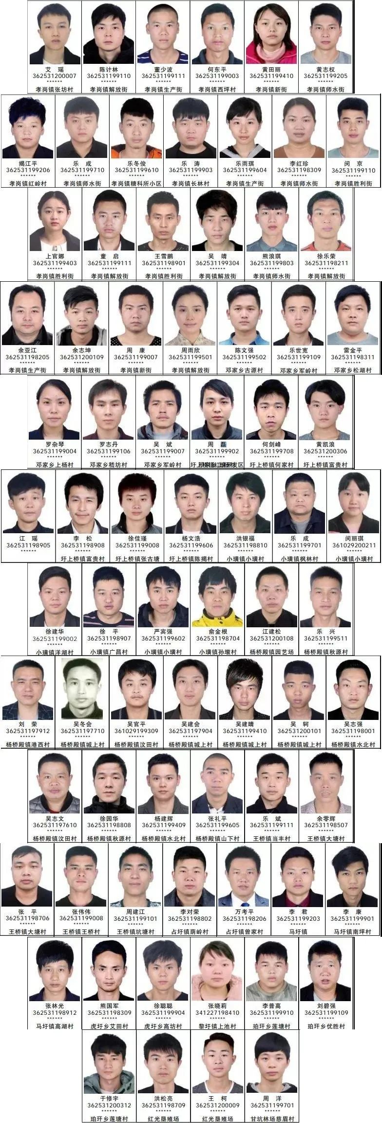 其中部分人员名单如下,姓名,身份证号码,户籍,长相统统曝光了个干净。↓
