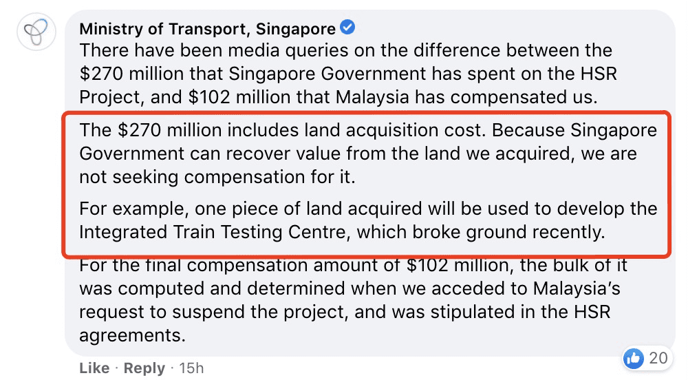 新加坡交通部特地强调了一下新加坡当初投资的2亿7000万新币,其中包括征地费用。