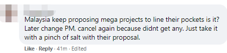 马来西亚不断提出大型项目来充实自己的口袋,是吗?后来换了总理,又取消了,因为没有得到任何好处。对于他们的提议,请谨慎对待。
