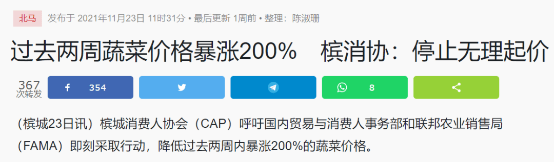 像是马来西亚北部的槟城,根据当地消费人协发布的报告显示,花椰菜从7令吉到16令吉,西兰花菜从8令吉涨到20令吉,红辣椒从13令吉涨至19令吉,以及青辣椒从10令吉涨至14令吉。