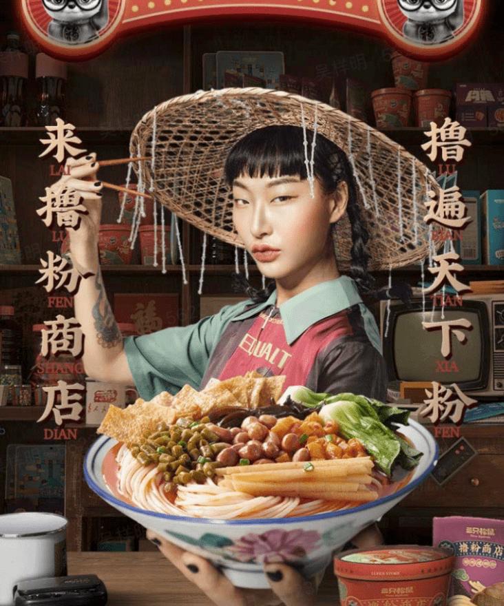 2019年10月,三只松鼠推出酸辣粉,找了一个名叫菜孃孃(niang,同娘)的广告模特出镜。