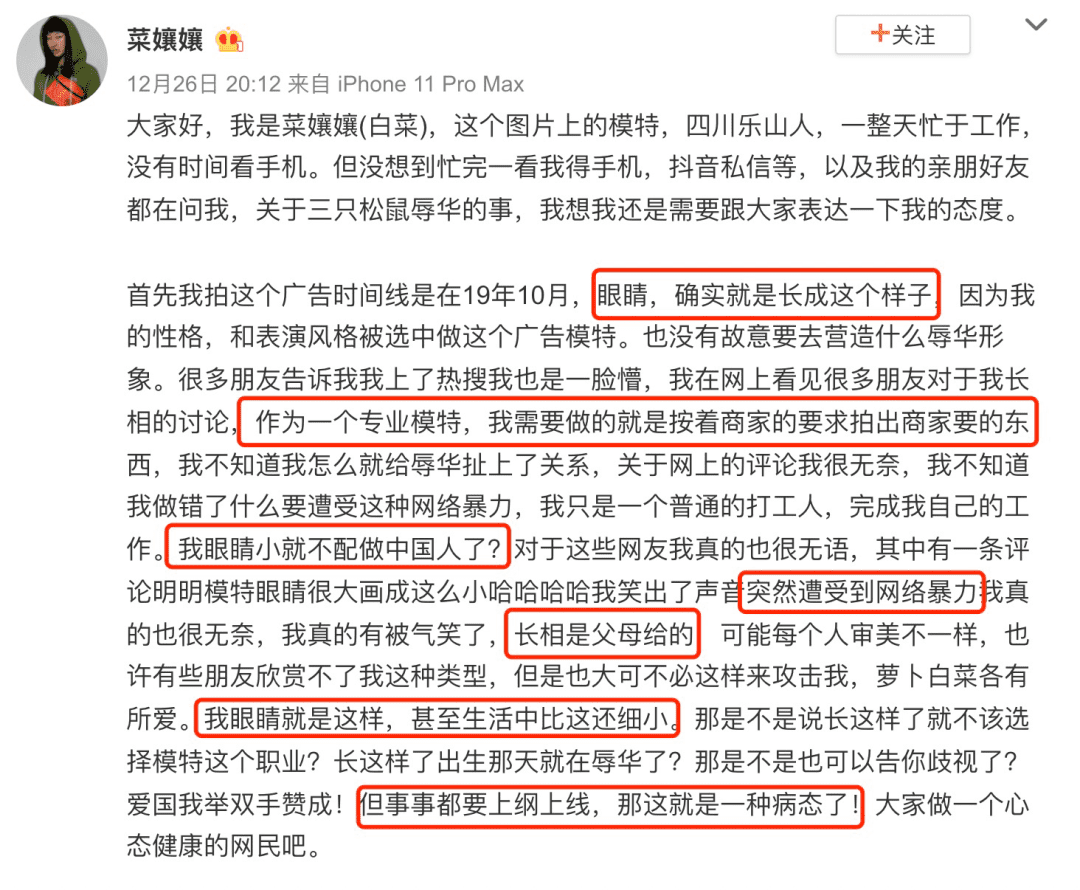 三只松鼠最后是道歉了,但道歉原因是因为模特妆容不符合大众审美↓