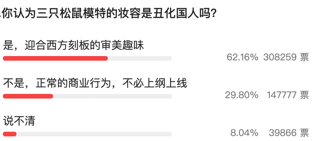 为此,还有国内媒体专门弄了个民意调查,问问大家三只松鼠的妆容到底是不是丑化中国人。