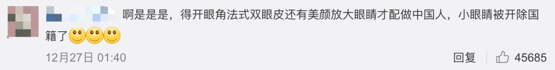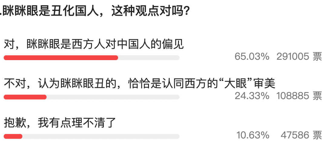 调查结果是超过一半的人都觉得,这样做是在丑化中国人,迎合西方审美。↓