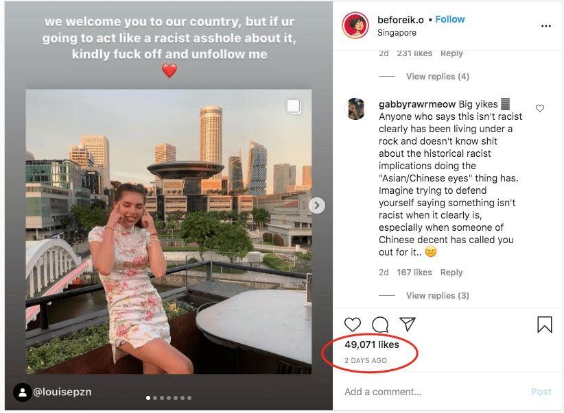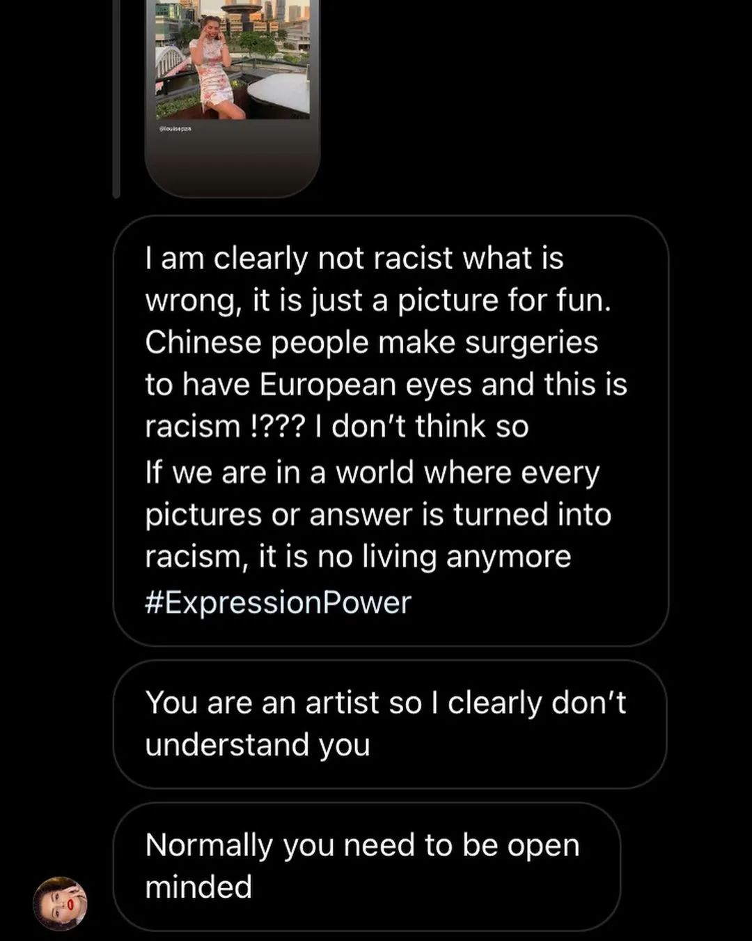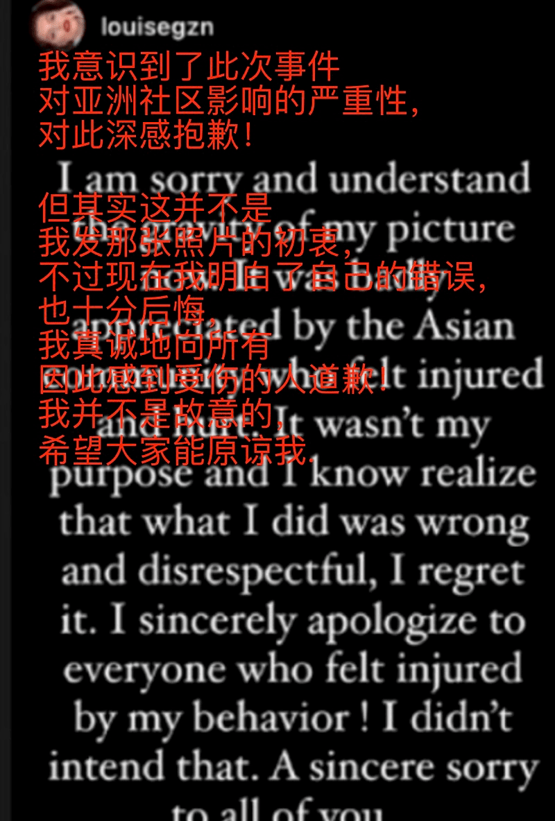 “...她这样不是道歉,如果她真的尊重别人那么从一开始就应该撤掉她的帖文而不是为自己争辩。被大家炮轰了才道歉。”