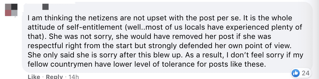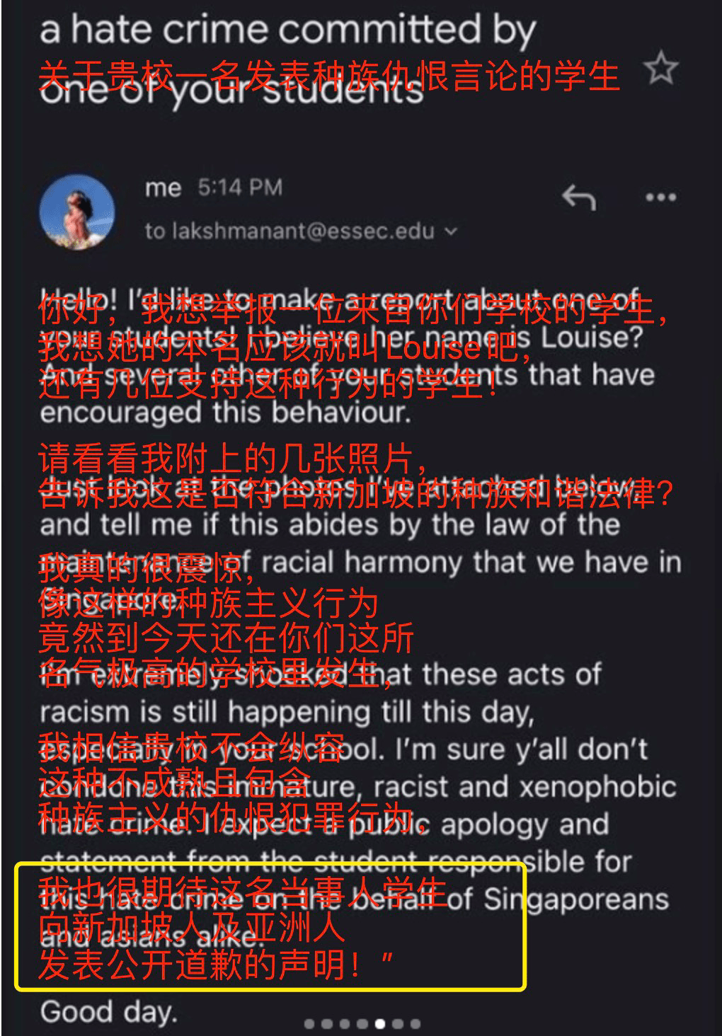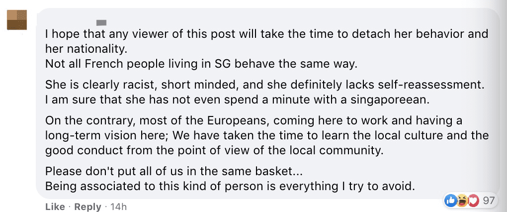 “...不是所有在新加坡的法国人都会像她这样。她很明显就是种族歧视,心胸狭隘,也没有个自觉。大部分来新加坡工作生活的人,会花时间学习本地的文化,融入社区学习观点看法。
