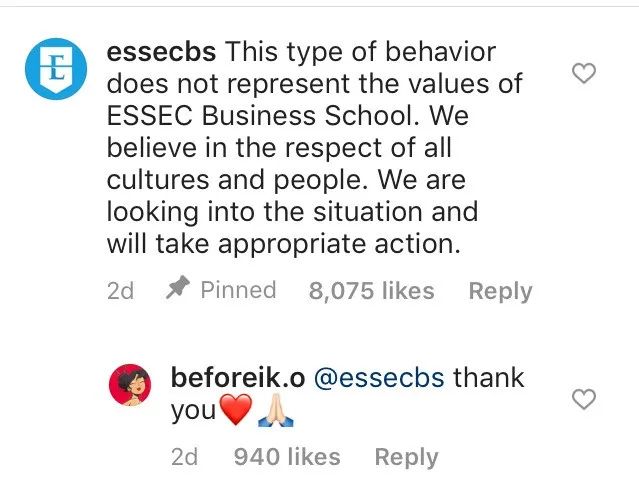 “这种行为不代表ESSEC商学院的价值观,我们尊重所有文化和人们,我们会进一步调查和采取行动。”