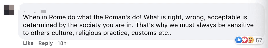 “入乡随俗懂不懂。对的错的,能不能接受都是取决于你所在的社会。这就是为什么我们总是对其他文化、宗教活动很敏感上心。”