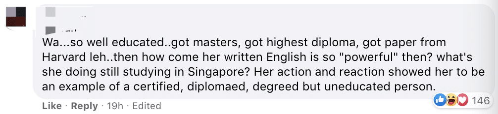 “这样的人到底是怎么在新加坡读的书?她的行为跟反应让人感觉就像一个没受过教育的人。”