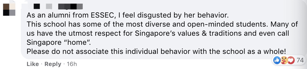 “作为校友,真是替她的行为感到恶心。我们学校还是有很多可以包容并且思想开明的学生的。我们大部分人都尊重新加坡的价值跟传统,也把这里叫做‘家’。不要让一粒老鼠屎坏了一锅汤!”