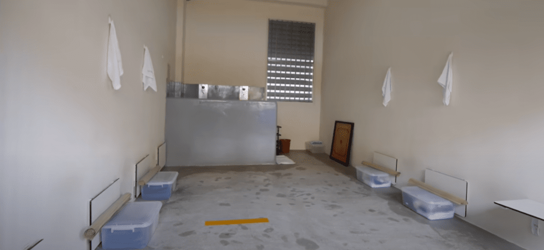 这里很简陋,一面 "遮羞墙 "将淋浴和厕所区域与牢房内的睡眠和生活区分开。
