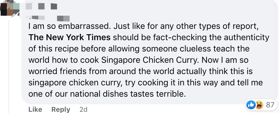 “很尴尬。纽约时报在播出的时候是不是可以先确认一下正宗的咖喱鸡是怎么做的。随随便便一个没水平没技术的来做新加坡咖喱鸡。现在好了,我都要担心一下世界各地的人是不是都觉得哦新加坡咖喱鸡就这,真的,新加坡国菜怎么可以被做成这种样子。”