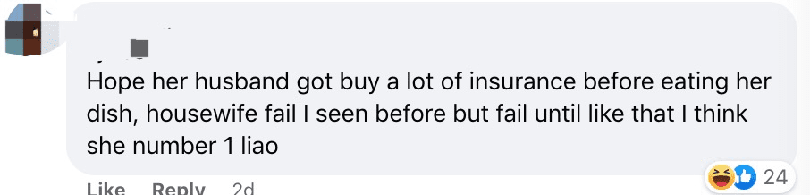 “希望做咖喱鸡的这个妹子的老公已经帮她买了保险。不然吃下去可不能保证。我看过很多家庭主妇做菜失败的,但做成这样子还是她第一。”