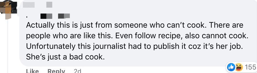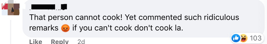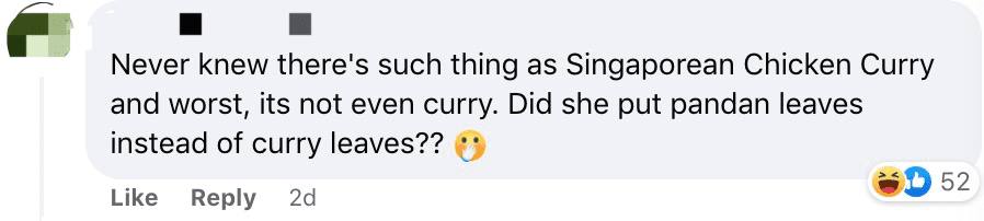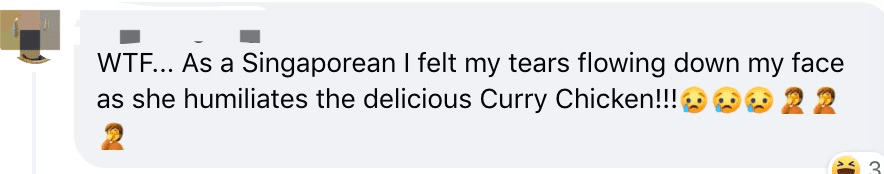 “这是什么东西。作为一个新加坡人我真的看的眼泪都要掉出来了。她真的挺侮辱咖喱鸡的。”