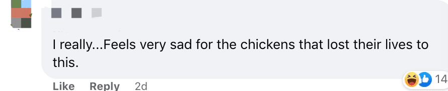 “我真的感觉非常伤心。鸡连命都豁出去了就只值这个水平?”